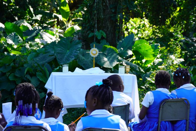 And it gets better — we were able to do Adoration at the school (another first). The children had just learned about Jesus being the bread of life, how he is truly present in the Eucharist, and then we adored Jesus in the Eucharist. They wrote some praises and intentions in an activity book, and Marisel and Luke played beautiful worship music as Father led a meditation.